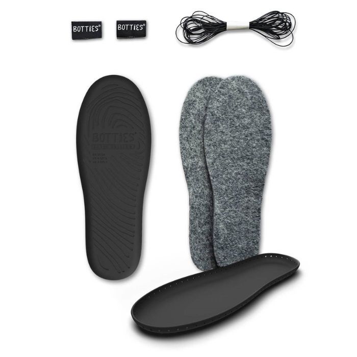 Contents of the packaging: 1 pair of Botties® soles BASIC EDITION, 1 pair of acrylic felt insoles, yarn for the zero round (black) and 1 pair of Botties labels.