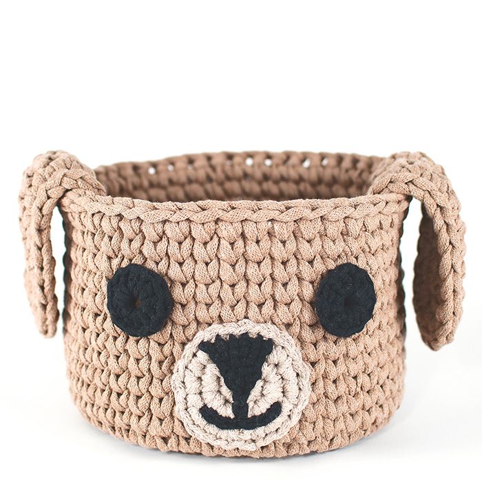 Yarn: Lilli Tube Yarn (80 % recycled cotton, 20 % polyester, 1 kg = 220 m) 640 g light brown (4). For eyes and embroidery, a small amount of Mini Tube Yarn (80 % recycled cotton, 20 % polyester, 1 kg = 355 m) in beige (3) and black (20).