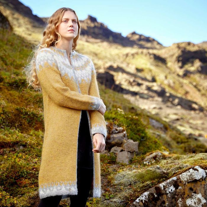 Védís Jónsdóttirin suunnittelema näyttävä islantilaisneuletakki. Tämä pitkä, naisellinen neuletakki neulotaan Plötulopi-villalangasta, joka on 100 % islantilaista villaa.