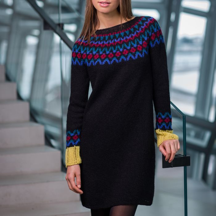 Védís Jónsdóttirin upea Revontulet-islantilaisneulemekko neulotaan islantilaisesta Einband-villalangasta. Mekko neulotaan helmasta aloittaen kuten perinteiset islantilaisneuleet.