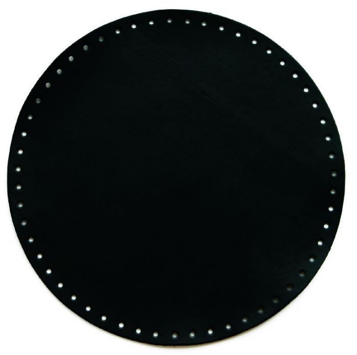 Round bag bottom made from artificial leather. The bag bottom, or bag base, has ready punched holes around the edge. This round bag bottom can be used to make a basket just as well. Simply pick up stitches through the holes to start your crochet basket.