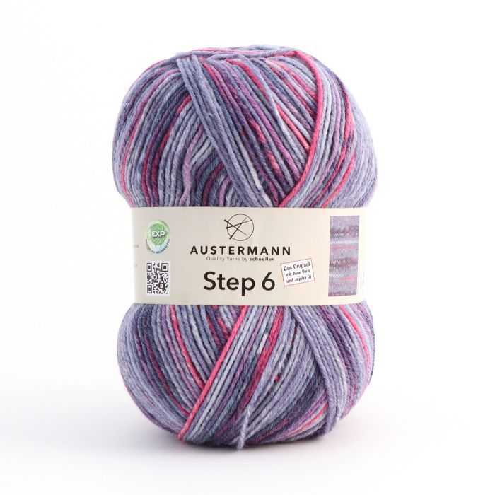 The thicker version of the popular Step sock yarn, Step 6 yarn, is an award-winning, innovative sock yarn that combines softness, quality and ecology. The step yarn is treated with Aloe Vera and Jojoba, which makes it soft and skin-gentle as well as comfortable to knit. Aloe Vera and Jojoba oil remain in the yarn up to 40 washes. Knit warm and comfortable wool socks from this favorite yarn that will last!