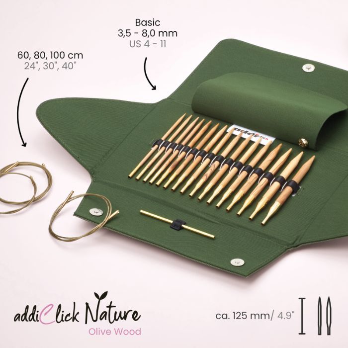 Monikäyttöinen addiClick Oliivipuu on oikea neuleharrastajan unelma - 8 erikokoista vaihdettavaa puikkoparia, kolme eri mittaista kaapelia, kymmenittäin erilaisia yhdistelymahdollisuuksia.