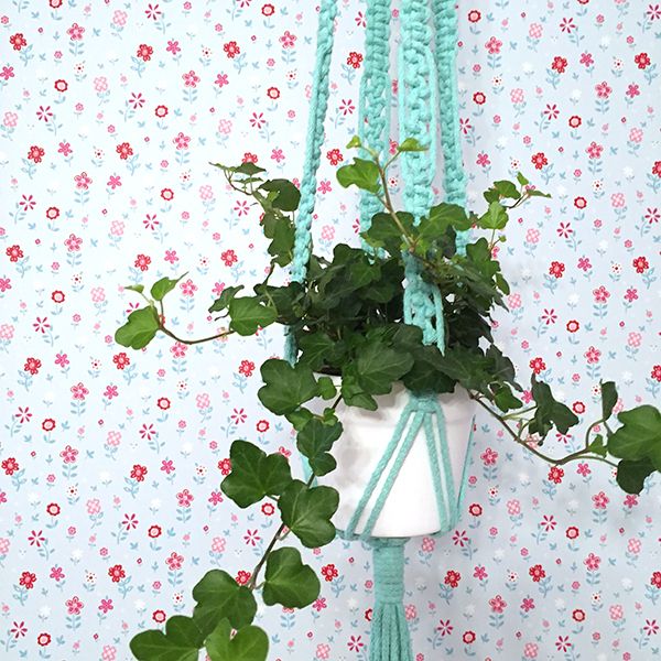 Paulina-punoskuteesta makrameetekniikalla solmeiltu kukka-amppeli. Lataa ilmainen ohje!
