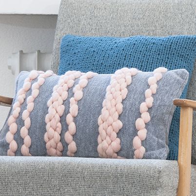 Selina-samettilangasta ja muhkeasta Grosso-villalangasta kudotun kauniin sisustustyynyn kudontaohje.