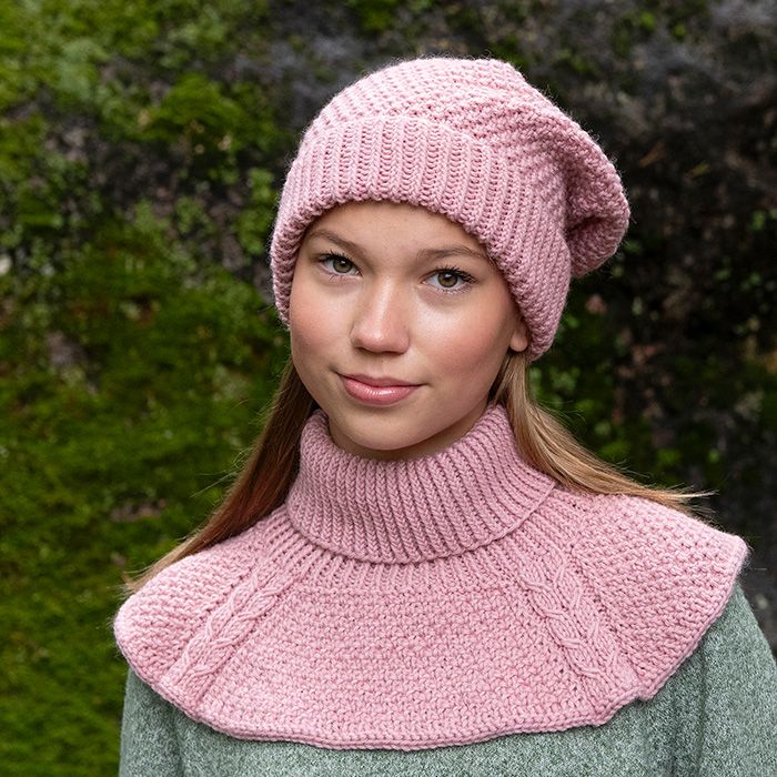 Neulo yhteensopiva asustesetti pehmeästä ja kulutusta kestävästä Alize Wooltime -langasta. Pidennetty helmineule tuo rennolle pipolle ja kaulurille eläväisen pinnan. Kaulurissa on lisäksi koristeelliset raglanpalmikot.