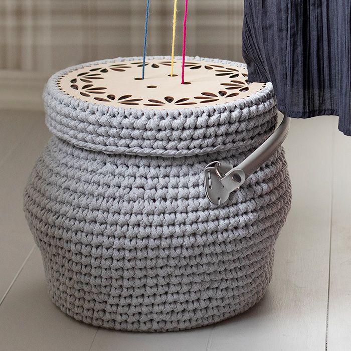 Virkattu lankavahti on kätevä säilytyspaikka neuletyölle ja langoille. Neuletyön lanka kulkee lankakorin kannen reikien kautta pitäen lankasi kulun sujuvana.