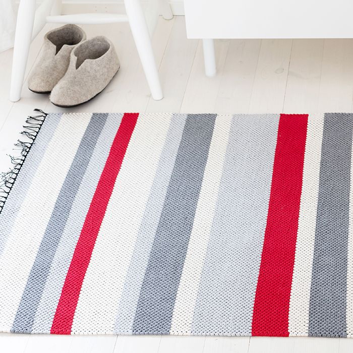Kude/matto: 0,8 kg luonnonvalkoista (02), 0,7 kg harmaata (17), 0,7 kg vaaleanharmaata (16) ja 0,3 kg punaista (14) Lankava Lilli -ontelokudetta (80 % kierrätyspuuvilla, 20 % polyesteri, 1 kg = n. 220).