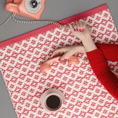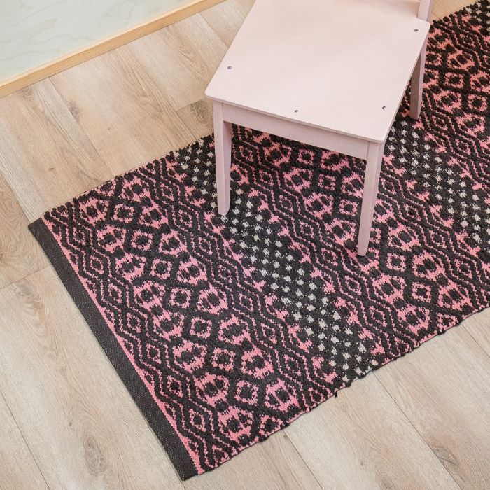 Pohjakude/matto: 1,7 kg vaaleaa roosaa (34) ja 0,3 kg beigeä (3) Lankava Eko -ontelokudetta (80 % kierrätyspuuvilla, 20 % polyesteri, 1 kg = n. 270 m).