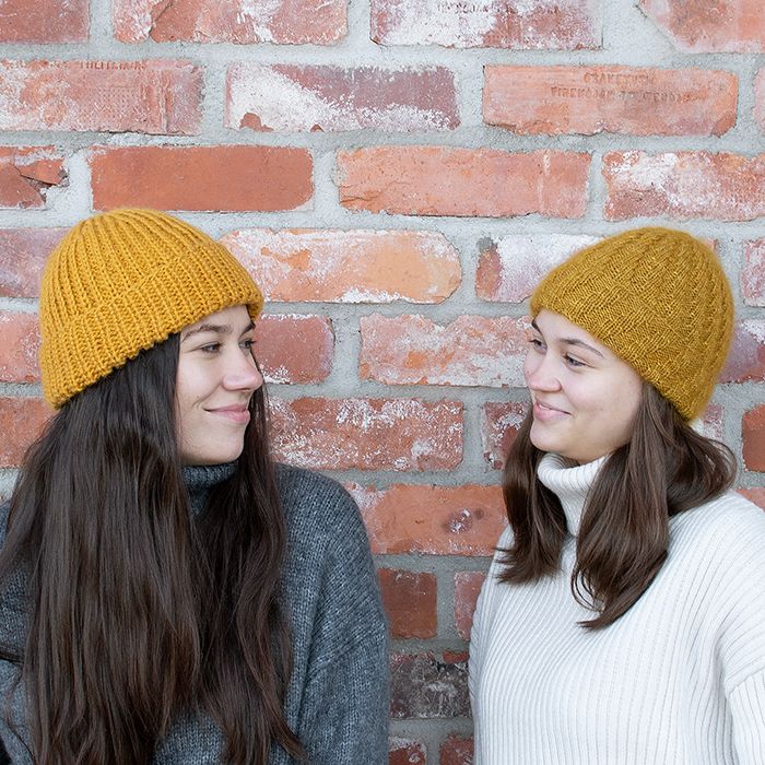 Tarvikkeet 50 g väriä Pomegranade (2088) Urth Harvest Fingering -lankaa (100 % villa, 100 g = n. 400 m) ja 20 g väriä Mustard (136) Filcolana Tilia -lankaa (70 % mohair, 30 % silkki, 25 g = n. 210 m). 40 cm pyöröpuikko ja sukkapuikot 3,5 mm