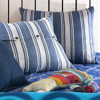 Raidalliseen pellavaloimeen kudotut tyynynpäälliset.