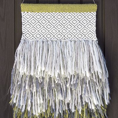 Eripaksuisista neulelangoista kangaspuissa kudottu pitkähapsuinen miniryijy.