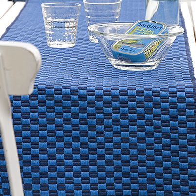 Esito-virkkuulankaloimeen kudottu kuviollinen loimiripsiliina. Kuteena ripsimoppi ja Esito-virkkuulanka. 6 vartta ja 4 polkusta.
