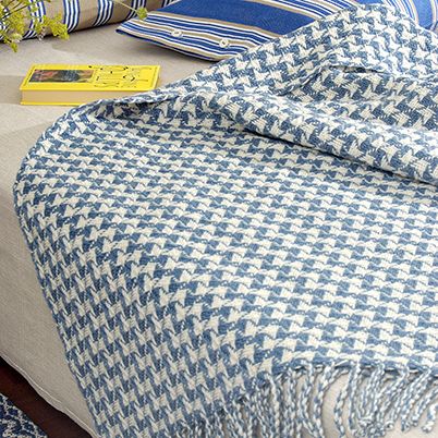 Kotimaisesta Sohvi-saalilangasta kudottu sinivalkoinen viltti. Sidoksena värinvaikutus kilpikankaassa. 8-vartta.