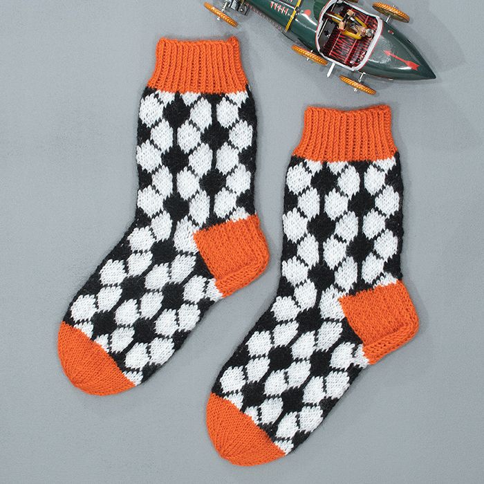 Lanka: 25 g valkoista (55) ja 15 g mustaa (60) Alize Superwash -sukkalankaa (75 villa %, 25 % polyamidi, 100 g = 420 m) sekä 20 g sahramia (466) Sulo-sukkalankaa (75 % villa, 25 % polyamidi, 100 g = 400 m)