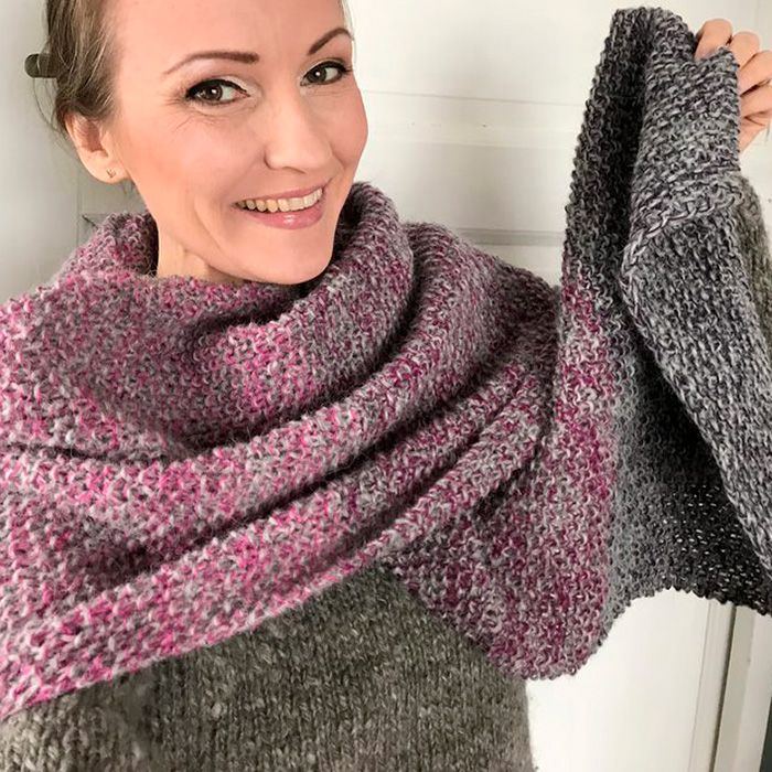 Lanka: Istex Plötulopi -hahtuvalankaa (100 % villa, 100 g = 300 m) 300 g vaaleanharmaata (1027). Istex Einband-lankaa (100 % villa, 50 g = 250 m) 50 g väriä Plum (9132), 50 g väriä Fuchsia (9142) ja 50 g väriä Pink (1768).
