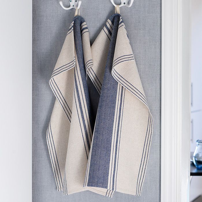 Kauniiden puuvillapellava-langasta kudottujen Marina-keittiöpyyhkeiden pinnassa on hempeä kalanruotokuvio.