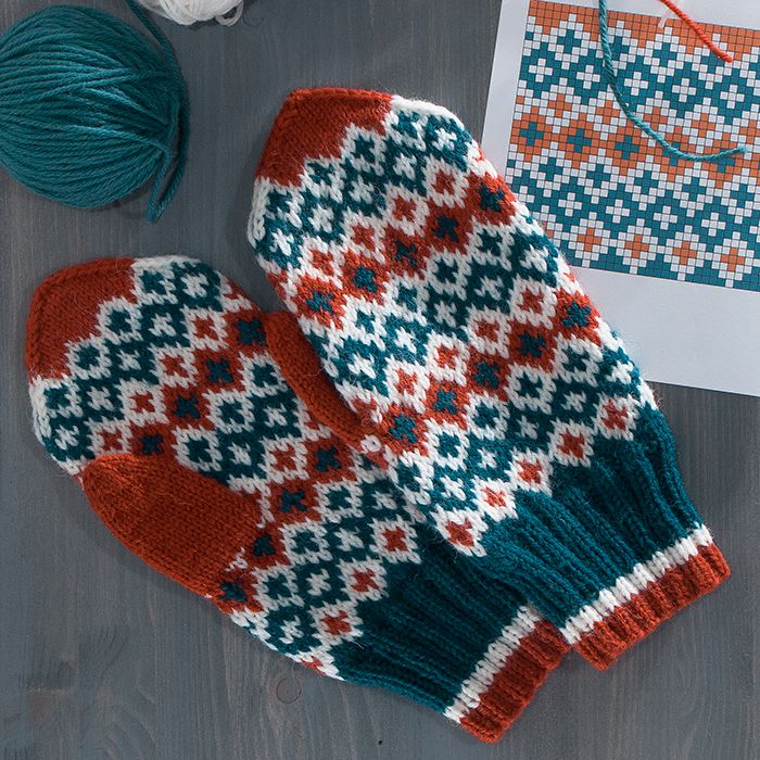 Isompaan käteen mahtuvat kirjoneulelapaset valmistuvat Pia-sukkalangasta.