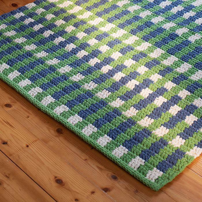 Raikas Ruoho-matto Lankava Mini-ontelokuteesta. Matto kirjovirkataan tasona, kolmella eri värillä ruutupiirroksen mukaan.
