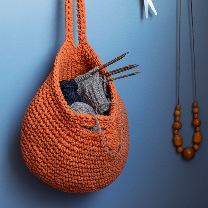 Kätevä ja suloinen seinälle ripustettava kori virkataan Lankava Pamela -punoskuteesta.