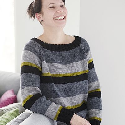 Alli-langasta neulottu kaunis raidallinen raglanhihainen villapusero, joka aloitetaan pääntieltä ja neulotaan pyörönä kohti helmaa. Helppo malli.