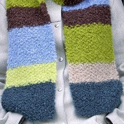 Tarvikkeet vihreää (322), limenvihreää (37), ruskeaa (321), sinivihreää (302), vaaleansinistä (318) ja beigeä (320) Lankavan Esito-lenkkimohairia (70 % mohair, 26 % villa, 4 % polyamidi. Vyyhti n. 240 g (+/- 10g) = n. 480 m).