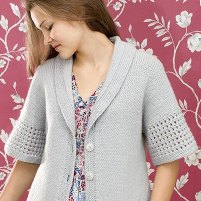 Kotimaisesta Sohvi-langasta neulottu lyhythihainen shaalikauluksinen jakku.