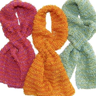 Esito-lenkkimohairista ja -kampalangasta suurilla puikoilla neulotut solmukehuivit.