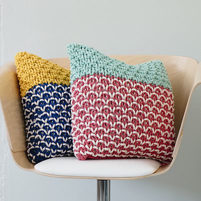 Lankavan Paulina-punoskuteesta neulotun tyynynpäällisen ohje. Tyynyn kaunis pinta syntyy neuloen rikottua helmineuletta kahdella värillä.
