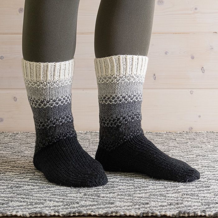 Kauniit Kaiku-villasukat ovat lämpimät perussukat, joiden väritystä voit varioida helposti makusi mukaan. Mallissa on vahvistettu kantapää ja kärjessä sädekavennukset.