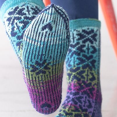 Nämä upeat kirjoneulesukat neulotaan Alize Superwash -sukkalangasta. Villasukissa leikitellään kauniisti yksivärisellä ja itseraidoittuvalla langalla.