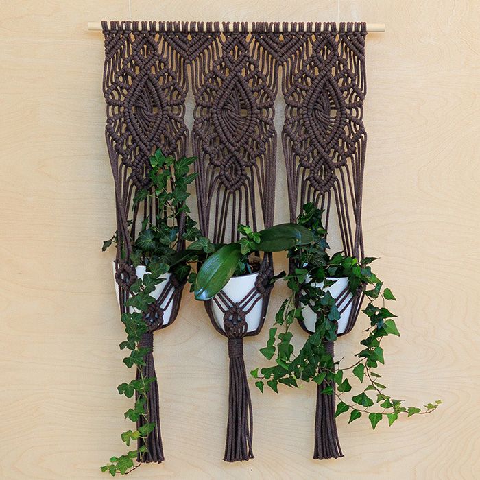 Koristeellinen ja näyttävä kolmen kukan amppeli solmeillaan kierrätyspuuvillaisesta Lankavan Paulina-punoskuteesta.