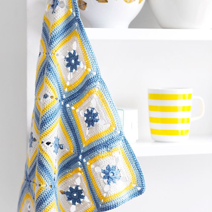 Lanka: 30 g valkaisematonta (9000), 30 g vaaleansinistä (9050), 30 g taivaansinistä (9051) ja 20 g keltaista (9034) Lankavan Esito-virkkuulankaa (100 % puuvilla, 200 g = n. 675 m).