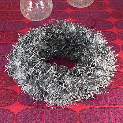 Paperinauhasta ja Decofur sim -langasta solmupuun avulla tehty muhkea kranssi.