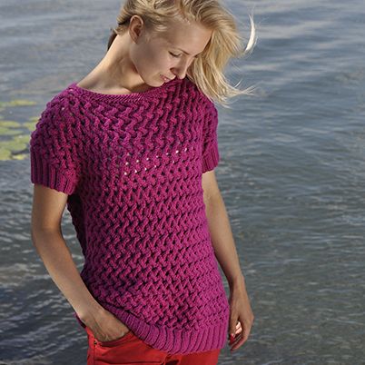 Puuvillaisen kesäpuseron neulos on näyttävää verkkomaista punospintaa.