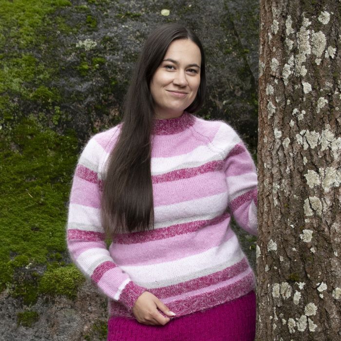 Pehmeän pörröinen Mohairpusero neulotaan kaksinkertaisella langalla Lankava Sulo -sukkalangasta ja Alize Kid Royal -mohairlangasta. Ilmettä neuleeseen tuovat vaihteleva raidoitettu värimaailma sekä kaarrokkeen raglanlisäykset.
