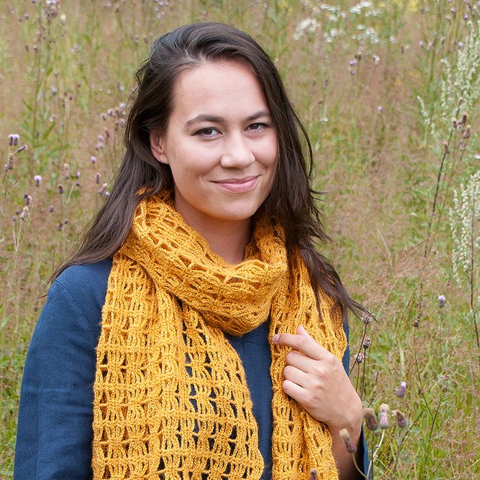 Alize Angora Gold Simli -langasta virkattu kaunis sahraminkeltainen huivi on kevyt mutta lämmittää ihanasti.
