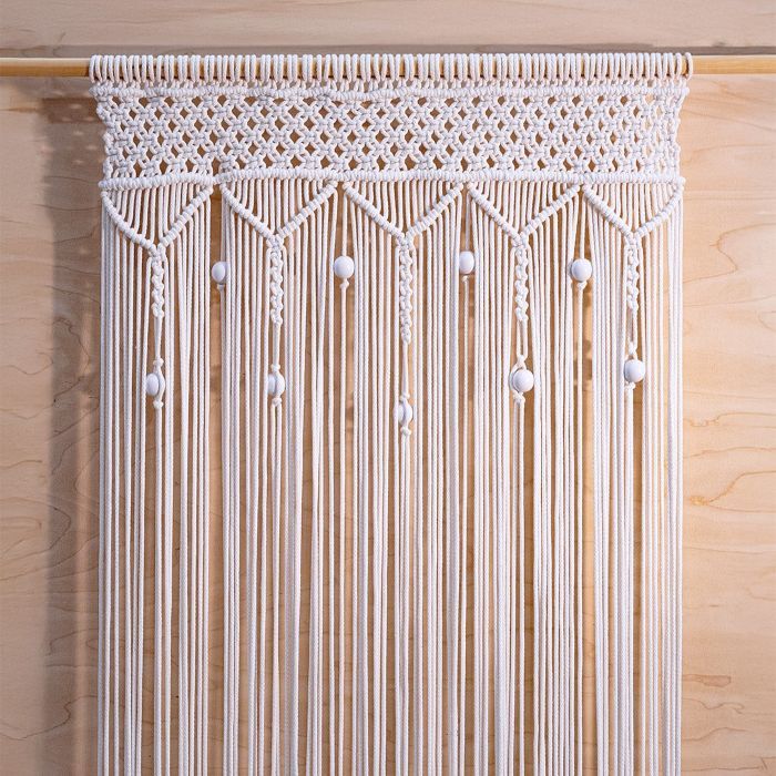 Helppo 77 cm leveän makramee-oviverhon malli. Huom! Ohjeessa mainittu Paula-punoskude on poistunut valikoimastamme. Voit korvata langan Paulina-punoskuteella.