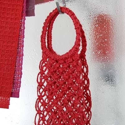 Makrameesolmeiltu selänpesin paksusta pellavanarusta.