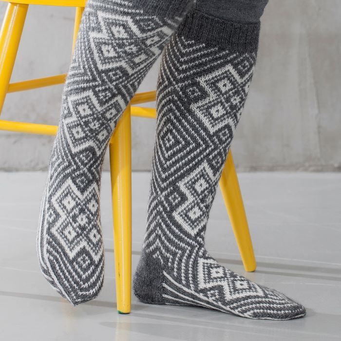 Kauniit polvipituiset kirjoneulesukat Alize Superwash -langasta. Näissä korkeavartisissa villasukissa on perintesesti tehty kantapää sekä kärjessä kapea nauhakavennus.