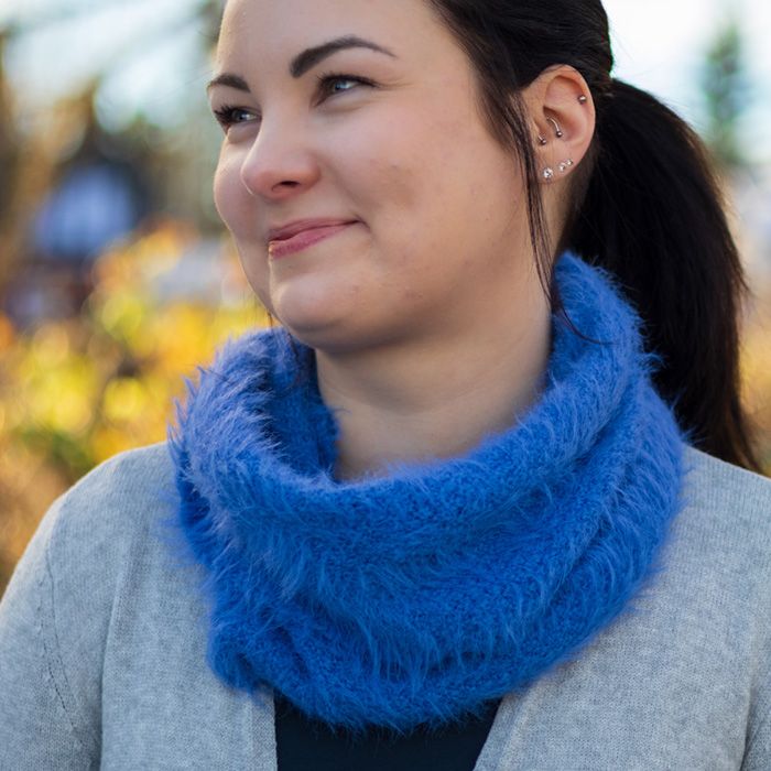Helppo Untuva-tuubihuivi neulotaan tasona pidennettynä helmineuleena. Lankava Untuva -pörrölangasta neulottu tuubi on lämmin, kevyt ja miellyttävän tuntuinen ihoa vasten.
