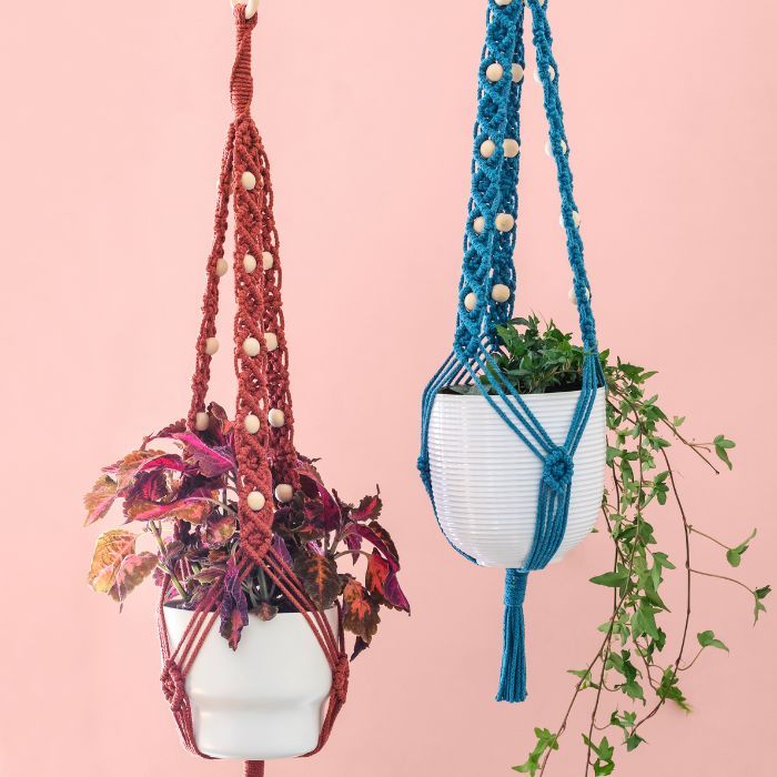 Solmeile kauniisti kuvioitu ja puuhelmin koristeltu Viisikko-amppeli Lankavan Pamela -punoskuteesta. Langan väriä vaihtamalla saat sisustukseesi sopivan kukka-amppelin viherkasveillesi.