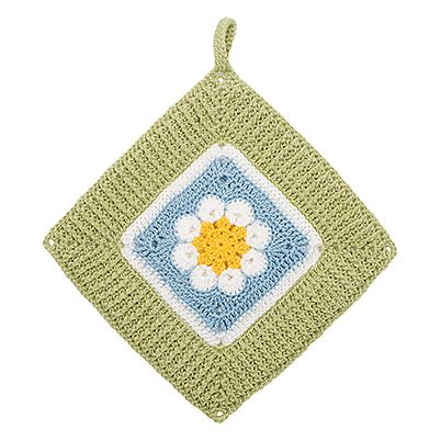Afrikankukka-mallilla ja kohopylväillä virkattu patalappu.