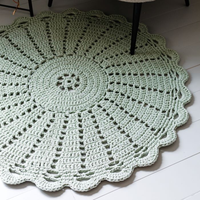 Lilli-ontelokuteesta virkattu pyöreä pitsimäinen matto. Halkaisija n. 105 cm. Helppo malli.