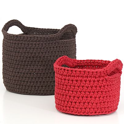 Lilli-ontelokuteesta virkattu kahvallinen pyöreäpohjainen kori. Kaksi kokoa.