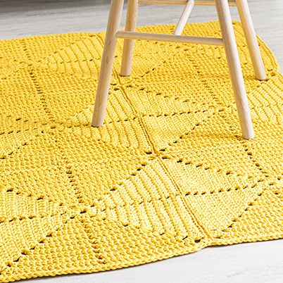 Keltaisesta puuvillatrikoosta virkattu matto. Helppo malli.
