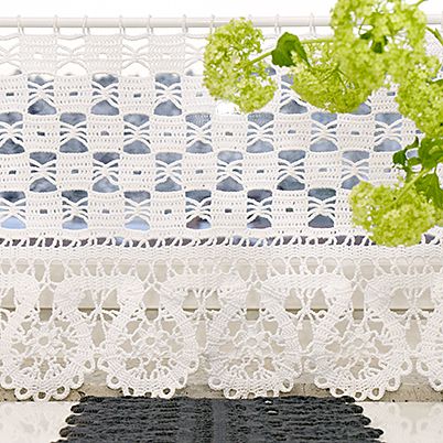 Merseroidusta puuvillalangasta osissa virkattu suurikuvioinen verhokappa.