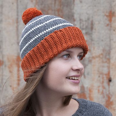 Joustavasta Alize Cashmira –langasta virkattu joustinreunuksinen tupsupipo. Helppo malli.