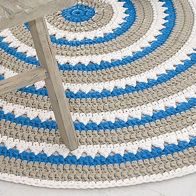 Esteri-ontelokuteesta virkattu kolmivärinen pyöreä matto. Helppo malli.
