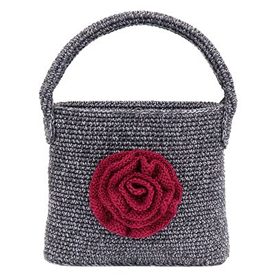 Harmaan raitapuseron loppulangoista virkattu napakka pikkulaukku neulotulla ruusukkeella. Helppo malli.
